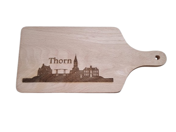 Borrelplank gegraveerd met skyline van Roermond of Thorn